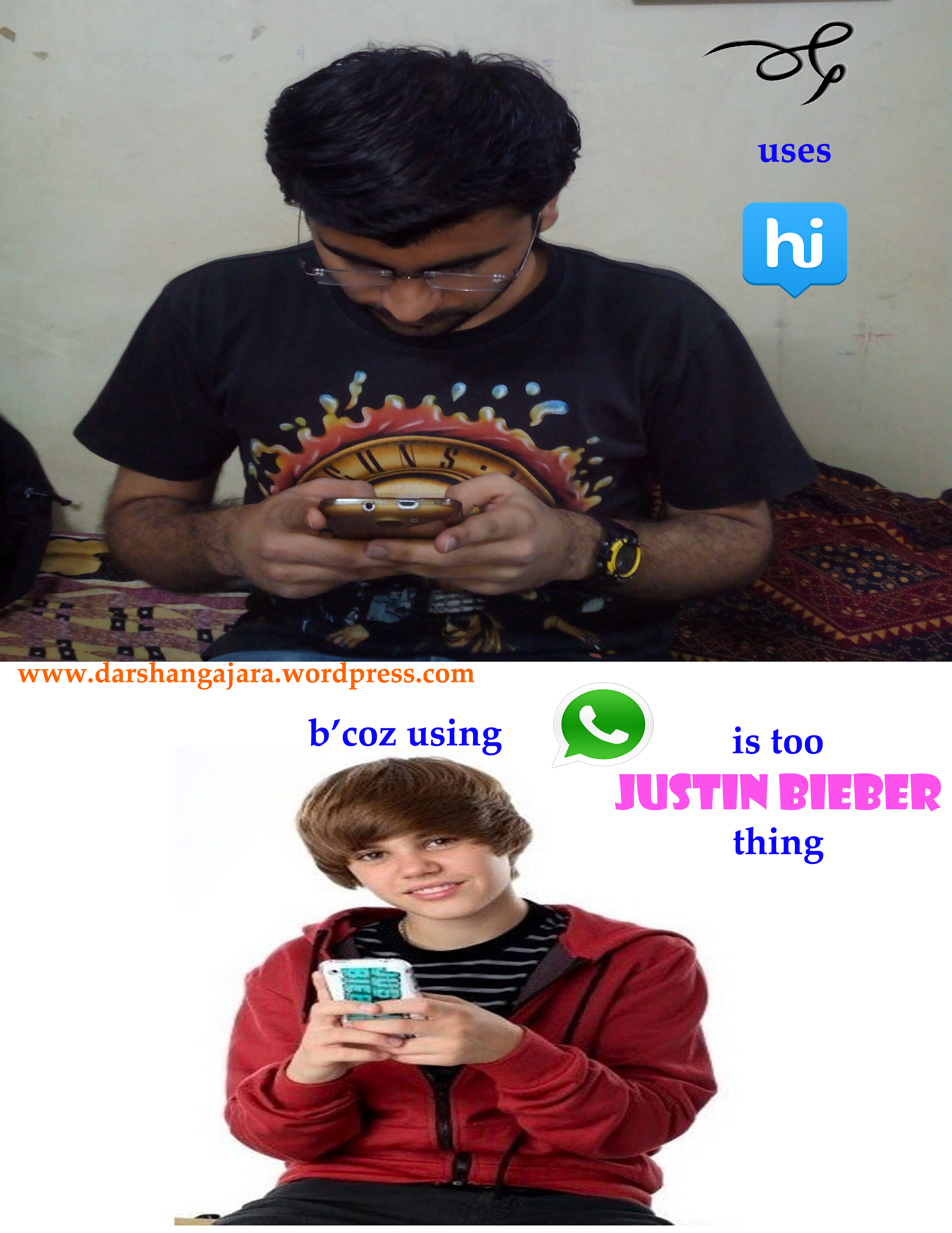WhatsApp + hike Meme Too mainstream, even Justin Bieber uses it :p Share this:TweetPocket Click to email a link to a friend (Opens in new window) Email Click to share on WhatsApp (Opens in new window) WhatsApp Like Loading...
